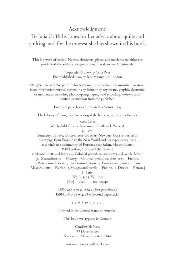 Celia Rees is the author of many novels for teens. WITCH CHILD is her first with Candlewick Press. After reading about seventeenth-century witch persecutions and Native American shamanism, she says, "It occurred to me that the beliefs and skills that would have condemned a woman to death in one society would have been revered in another. That got me thinking, what if there was a girl who could move between these two worlds?... Mary came into my head and WITCH CHILD began."
