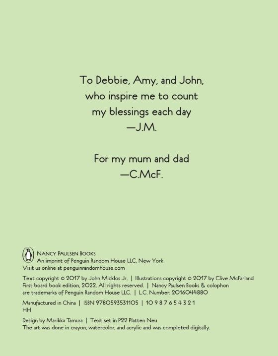 * “This cleverly structured narrative tracks the progression of the seasons, honoring the mathematical structure underlying the yearly cycle. The text counts the leaves appearing on a tree over the course of spring, counts back down as the leaves drop off in the autumn, and circles back around to the following spring when the count begins anew. Micklos’s concise rhyming verse employs an impressive economy of language, which is bolstered by McFarland’s bright, textured collage-style art. A first purchase with important connections to early mathematical learning and natural science.” —