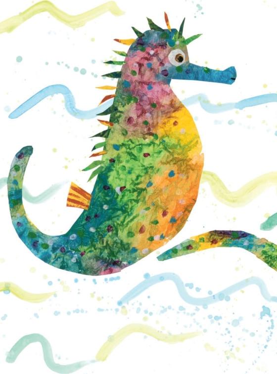 "In his elegant painted tissue-paper collages, Carle innovatively balances pastel hues with shocks of brilliant color, creating an appealing seascape that succeeds swimmingly." (