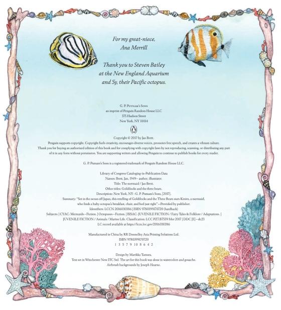 "In an aquatic version of 'Goldilocks and the Three Bears,' Kiniro, the beautiful mermaid, is intrigued by the mystique and beauty of [a] little seashell house. . . Not only is this fractured fairy tale a delight to read, there is also an adorable side story skillfully told in the border art as only Brett can. Set in the waters off of the coast of Okinawa, this colorful picture book is exquisite."—