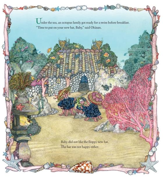 “A baby octopus waved its little arms at me when I glimpsed it on some coral while in the ocean off the island of Okinawa when I was visiting my daughter and her husband. It wasn’t until I returned home and was musing over what creatures would take the place of the three bears in my under-the-sea Goldilocks story that it dawned on me that octopuses, intelligent and mischievous, would be just right. I admired the Okinawan houses and made the Octopus house like the island ones. When I worried out loud that the octopuses looked alien, my young friend Alma suggested they wear hats. Now the setting and the clothes were Japanese.