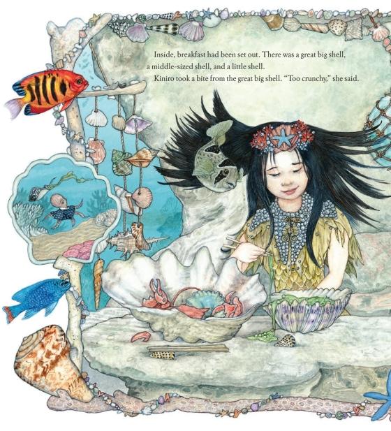 When Kiniro, a young mermaid, comes upon a gorgeous house made of seashells and coral, she is so curious that she goes inside. She’s thrilled to find a just-right breakfast, pretty little chair, and, best of all, a comfy bed that rocks in the current.