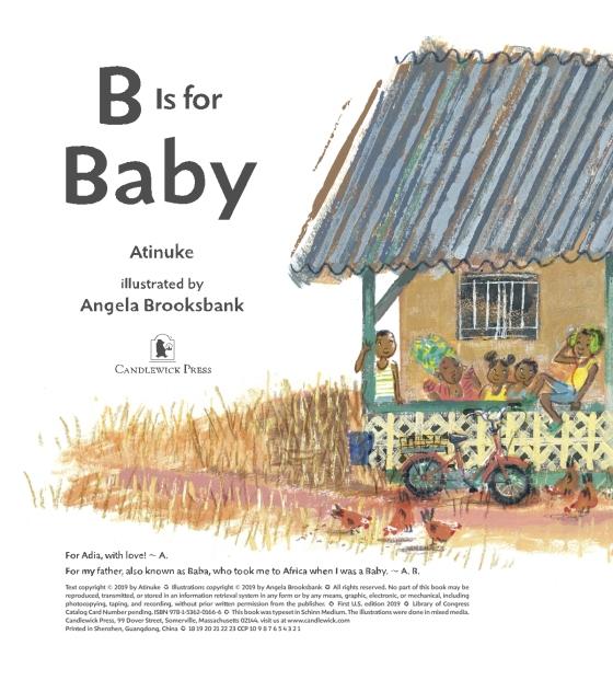 The Nigerian-born writer Atinuke plays with our expectations of how ABC books progress with “B Is for Baby” (Candlewick, 32 pages, $16.99), a picture book set in Africa that never moves beyond the one letter...The warm colors and loose lines of Angela Brooksbank’s mixed-media pictures exude happiness and reassurance for readers ages 2-6.