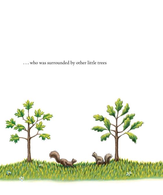 Autumn arrives, and with it the cool winds that ruffle Little Tree's leaves. One by one the other trees drop their leaves, facing the cold of winter head on. But not Little Tree—he hugs his leaves as tightly as he can. Year after year Little Tree remains unchanged, despite words of encouragement from a squirrel, a fawn, and a fox, his leaves having long since turned brown and withered. As Little Tree sits in the shadow of the other trees, now grown sturdy and tall as though to touch the sun, he remembers when they were all the same size. And he knows he has an important decision to make.