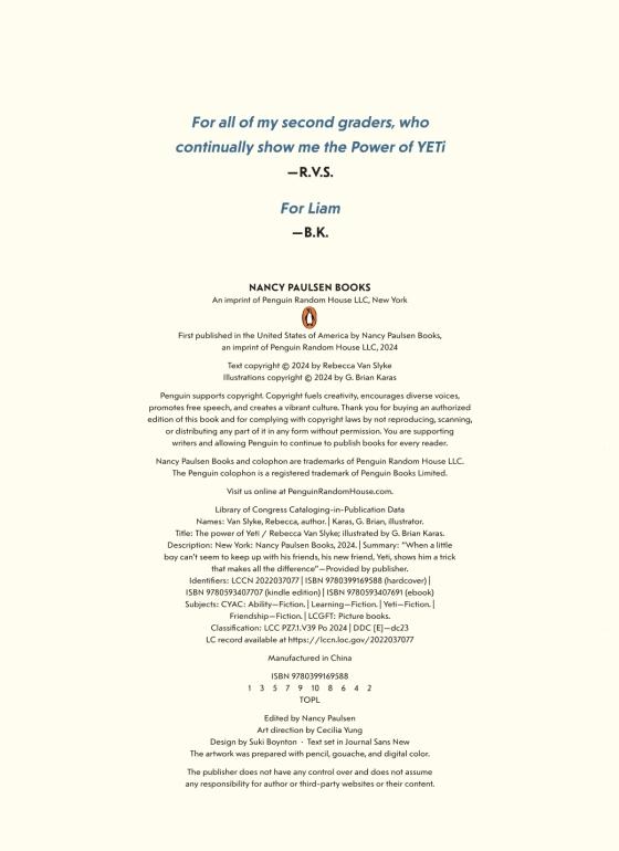 When a little boy can't keep up with the other kids, his new friend Yeti reveals a trick that makes all the difference.Some days it seems like everybody is bigger, stronger, and faster than you, and that has one little boy feeling blue. Fortunately, a surprising someone steps in to help--a big, hairy Yeti--along with some very impressive relatives: Bigfoot, Sasquatch, and the Abominable Snow Monster! But it is Yeti who claims to be the most powerful one in his family, all because of . . . the POWER OF YETI! This is the power that comes with knowing you can succeed, but it will take time and effort. And thanks to Yeti’s words of encouragement, the boy starts looking at things in a new light. He doesn't know how to tie his shoelaces . . . YETi! And he's not great at making soccer goals . . . YETi! He might not be the biggest, strongest, or fastest kid on the playground, but it turns out he's still pretty powerful and full of potential--all because of the power of YETi.