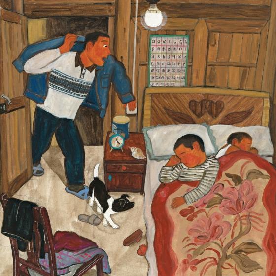 Mama and the two children (the elder of whom narrates) wake early one morning to accompany Baba to his tea garden. It’s a special treat, as Baba usually goes alone. They eat a filling breakfast in their cramped but cozy home, pack lunches, strap wicker baskets to their backs, and head out. Illustrations depicting their early-morning trek feature foggy landscapes and steep climbs full of wonder. The kids are excited about it all—the bamboo partridges hiding among the plants, the praying mantis they spot, their echoing songs and laughter, the competition to see which of them can pick more tea leaves. It’s tough work and irritating to the skin, but the narrator’s enthusiasm never dims. Even during their lunch break, the kids dart around, picking fruit and fetching water. After a nap, some rain, more partridge sightings, and more work, the sun begins to fall, and a lovely panorama shows families walking down mountain paths with full baskets on their backs. They bring their bags to a bustling tea factory, where the tea farmers line up to sell their harvest. Reminiscent of Diego Rivera’s work, Yu’s artwork, with its bold strokes and earthy colors, lovingly portrays a hardworking farming family. Xu’s text, translated from Chinese, perfectly captures a child’s perspective, acknowledging the characters’ travails while focusing on everyday joys.