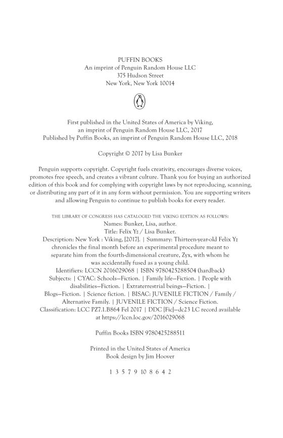 “If it wasn’t for the fused-with-Zyx thing, I suppose I would just be normal—whatever that means.” When Felix Yz was three years old, a hyperintelligent fourth-dimensional being became fused inside him after one of his father’s science experiments went terribly wrong. The creature is friendly, but Felix—now thirteen—won’t be able to grow to adulthood while they’re still melded together. So a risky Procedure is planned to separate them . . . but it may end up killing them both instead.