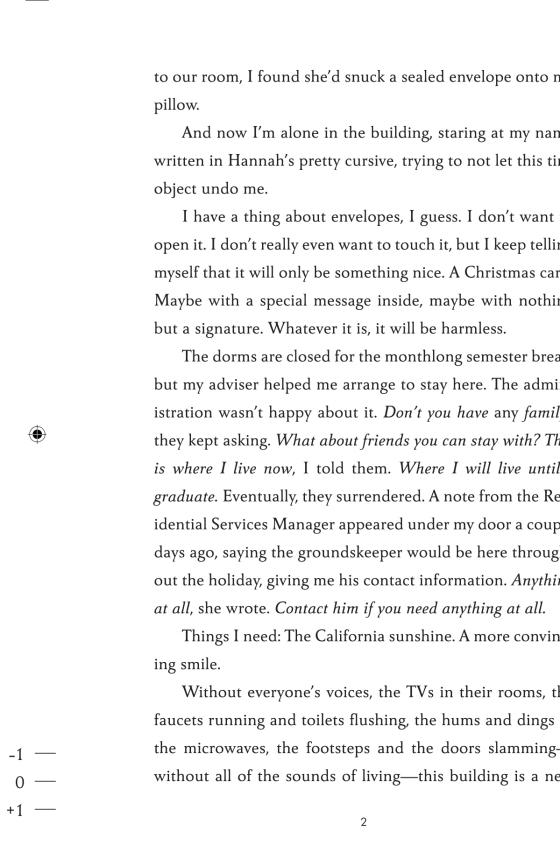 BookpageYou go through life thinking there’s so much you need. . . . Until you leave with only your phone, your wallet, and a picture of your mother. Marin hasn’t spoken to anyone from her old life since the day she left everything behind. No one knows the truth about those final weeks. Not even her best friend Mabel. But even thousands of miles away from the California coast, at college in New York, Marin still feels the pull of the life and tragedy she’s tried to outrun. Now, months later, alone in an emptied dorm for winter break, Marin waits. Mabel is coming to visit and Marin will be forced to face everything that’s been left unsaid and finally confront the loneliness that has made a home in her heart.