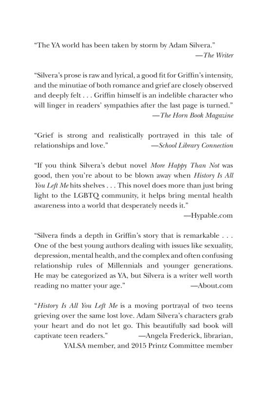 History Is All You Left Me quietly shows how dealing with loss will help Griffin see himself and his world more clearly. It's a painful coming of age, but a beautifully written and very satisfying one.”