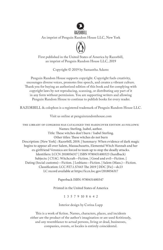 These Witches Don’t Burn is an original, thrillingly romantic spin on the classic teen witch tale. Infused with page-turning suspense, bittersweet romance, shocking twists, and tragic turns, Sterling has written a standout debut. Never sentimental, often sweet, but unafraid to break your heart, the writing is as lovely, vibrant, and ruthless as its characters."
