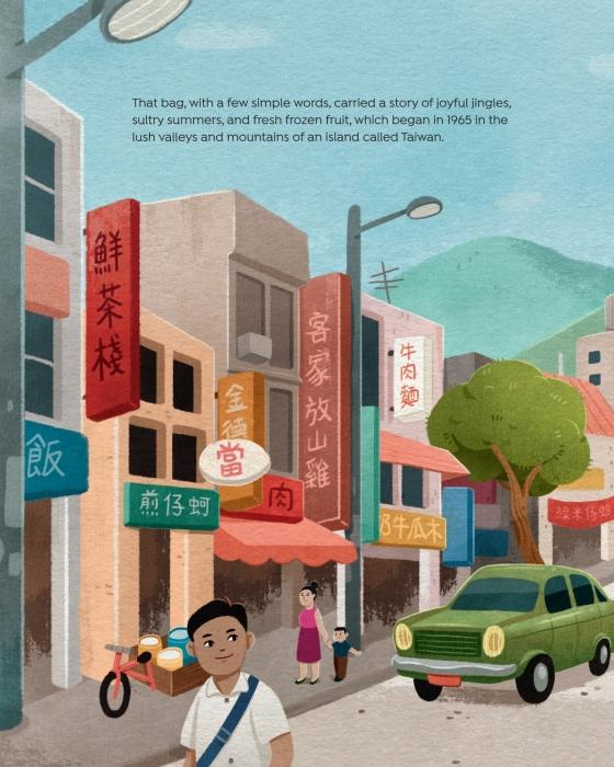 This fun and fascinating biography of a Taiwanese ice pop entrepreneur—the author's beloved grandfather—is a terrific read-aloud about inventiveness and the treats of summer.Charlotte Cheng's grandfather always had a bag of coins rustling in his pocket. That bag carried with it "a story of joyful jingles, sultry summers, and fresh frozen fruit which began in 1965 in the lush valleys and mountains of an island called Taiwan."