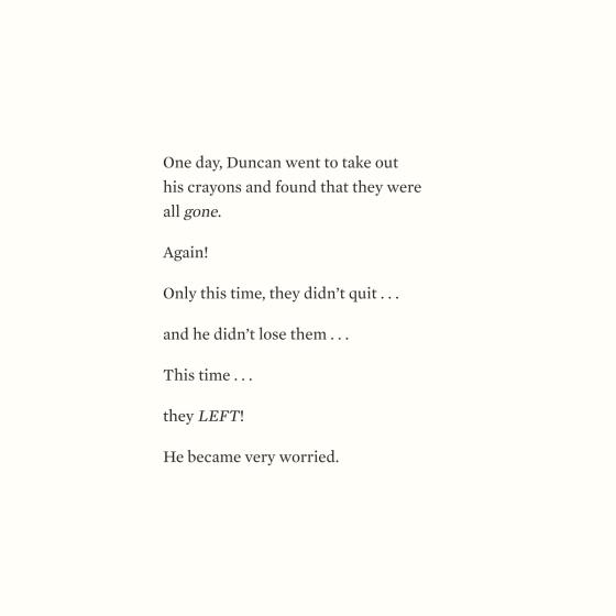 After convincing one group of crayons to go back to work after they wanted to quit and rescuing another group who got lost in the most inconvenient places, Duncan’s crayons have disappeared once more.