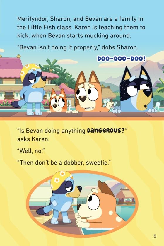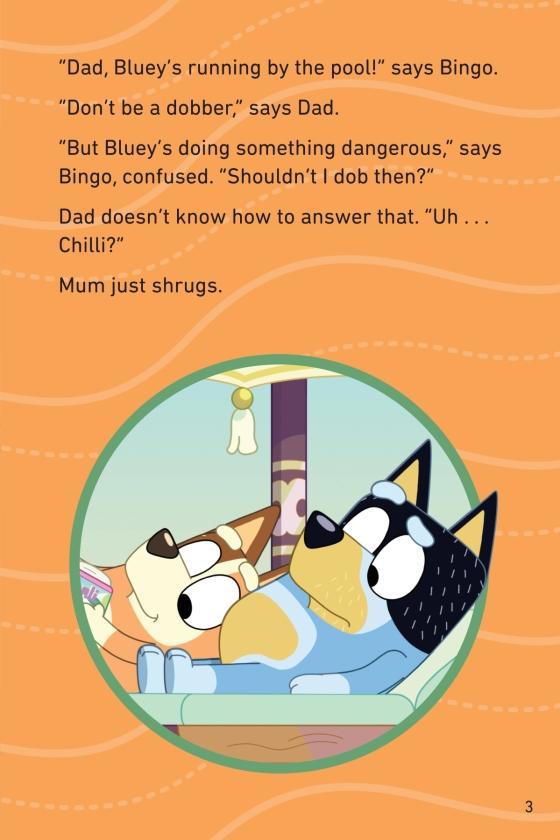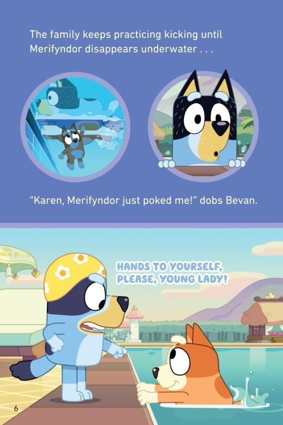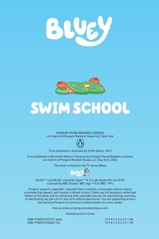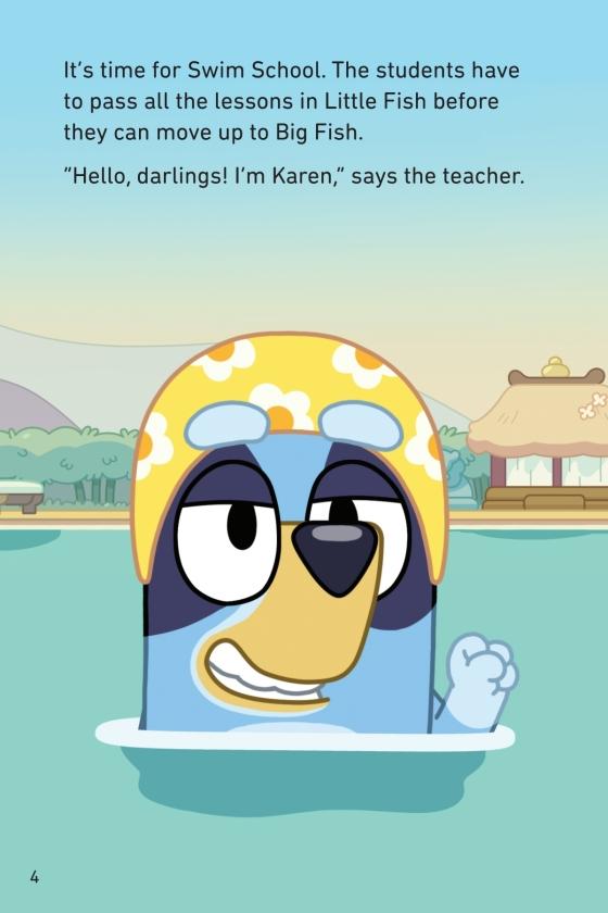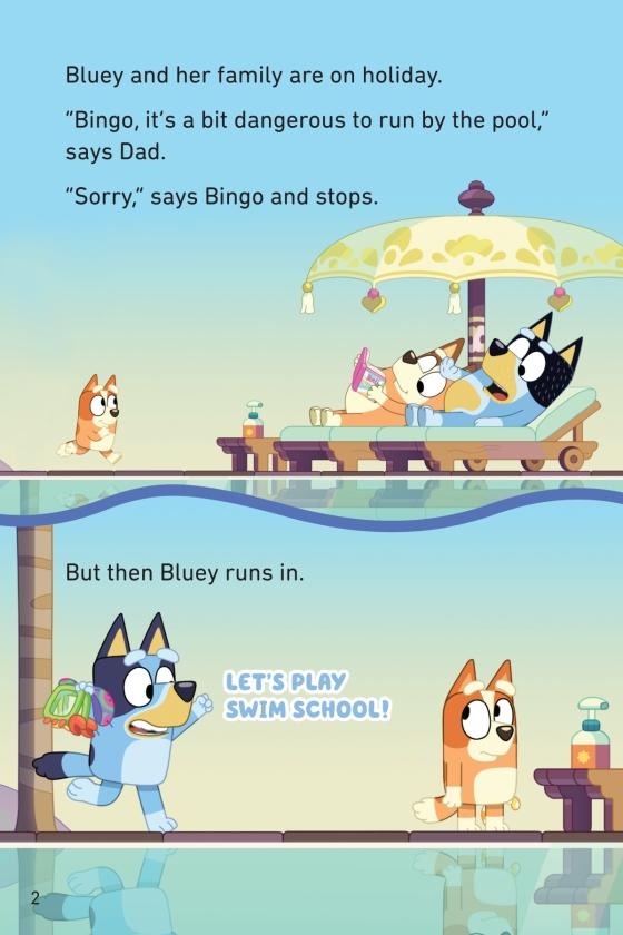 Go to swim school with Bluey and her family in this fun storybook based on the successful animated series Bluey, as seen on Disney+Bluey and her family are playing Swim School! But their swimming lessons are proving to be difficult. Can Mum, Dad, and Bingo pass without dobbing on each other? Read along to find out!