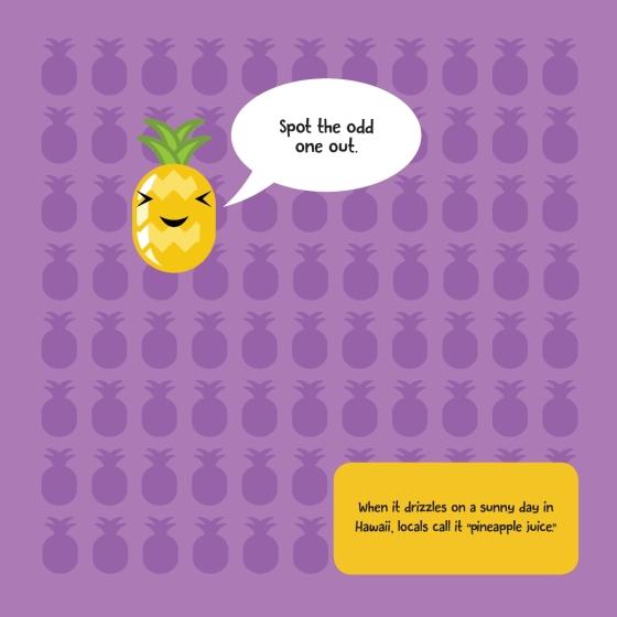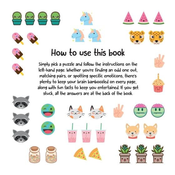 Fiendishly tricky spotting puzzles to boggle your brain. There are odd-ones-out to spot, pairs to match, color-matching puzzles and much more, all with colorful, cute emojis. What's more, readers can time themselves on each challenge and learn funny facts as they go.Pick out a particular pineapple and discover the donut that's different in this extreme search-and-find puzzle book.