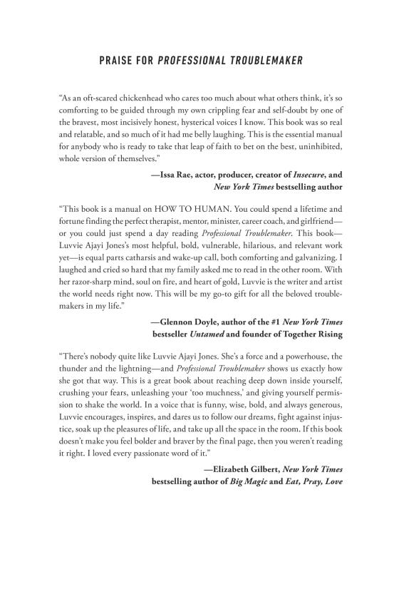 BE TOO MUCH, and use it for good. That is what it means to be a troublemaker. In this book, Luvvie Ajayi Jones--bestseller of books, sorceress of side-eyes and critic of culture--gives you the permission you might need to be the troublemaker you are, or wish to be. This is the book she needed when she was the kid who got in trouble for her mouth when she spoke up about what she felt was not fair. This is the book she needed when kids made fun of her Nigerian accent. This is the book that she needed when it was time to call herself a writer, but she was too scared.