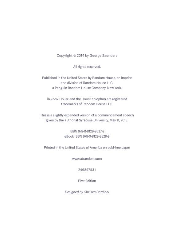 The New York Times, where its simple, uplifting message struck a deep chord. Within days, it had been shared more than one million times. Why? Because Saunders’s words tap into a desire in all of us to lead kinder, more fulfilling lives. Powerful, funny, and wise,