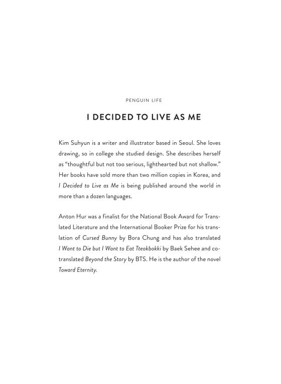 I Decided to Live as Me really tries to help—and succeeds. . . . The author’s honesty holds your attention. It’s easy to empathize as she describes her own shortcomings and vulnerabilities because they are our own as well. . . . Kim’s charming and simple illustrations have a way of sticking with you. . . . The problems discussed are universal concerns in the age of information and social media. . . . One wonders if [this book] should be considered essential reading for government social welfare policymakers! . . . Accomplished translator Anton Hur . . . has done an excellent job in maintaining the spirit of the writing which made the original Korean version a bestseller. . . . I enjoyed this book. I feel I learned something, and it encouraged me to learn more and live better.” —