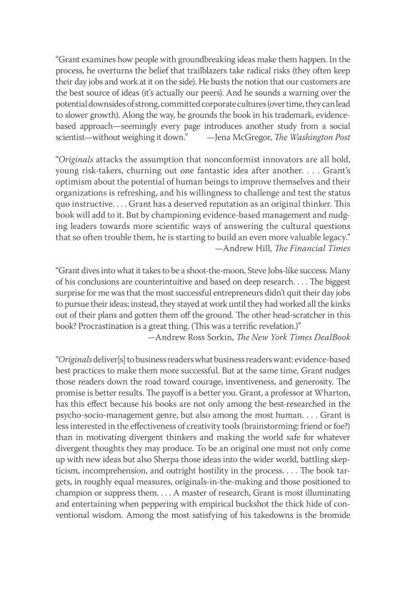 “Originals is one of the most important and captivating books I have ever read, full of surprising and powerful ideas. It will not only change the way you see the world; it might just change the way you live your life. And it could very well inspire you to change your world.” —Sheryl Sandberg, COO of Facebook and author of Lean In