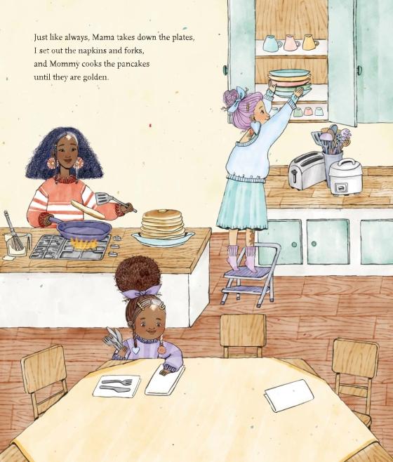 charming art and lyrical storytelling. It’s no big deal that the family is pictured as African American and has same-sex parents. Instead, the focus is on learning to navigate everyday emotions.