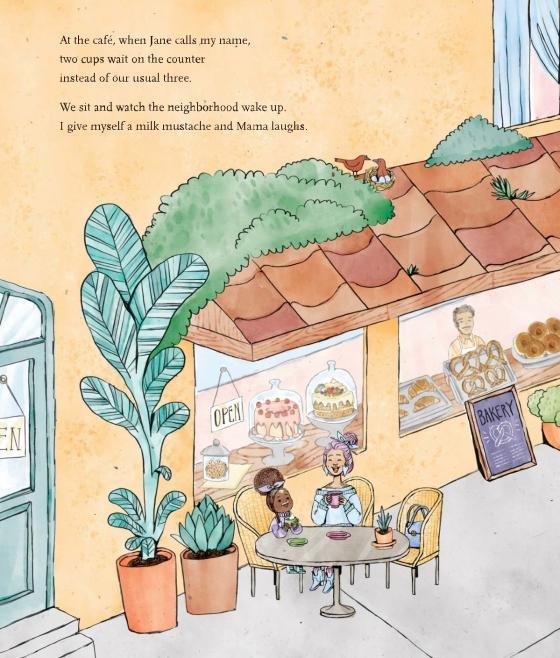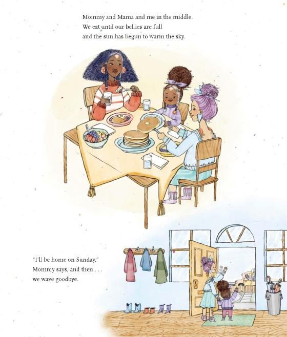 A little girl stays home with Mama when Mommy goes off on a work trip in this tender, inviting story that will resonate with every child who has missed a parent.For one little girl, there’s no place she’d rather be than sitting between Mama and Mommy. So when Mommy goes away on a work trip, it’s tricky to find a good place at the table. As the days go by, Mama brings her to the library, they watch movies, and all of them talk on the phone, but she still misses Mommy as deep as the ocean and as high as an astronaut up in the stars. As they pass by a beautiful garden, the girl gets an idea . . . but when Mommy finally comes home, it takes a minute to shake off the empty feeling she felt all week before leaning in for a kiss. Michael L. Printz Award winner Nina LaCour thoughtfully renders a familiar, touching story of a child who misses a parent, illustrated by Kaylani Juanita, whose distinctive style brings charm and playfulness to this delightful family of three.