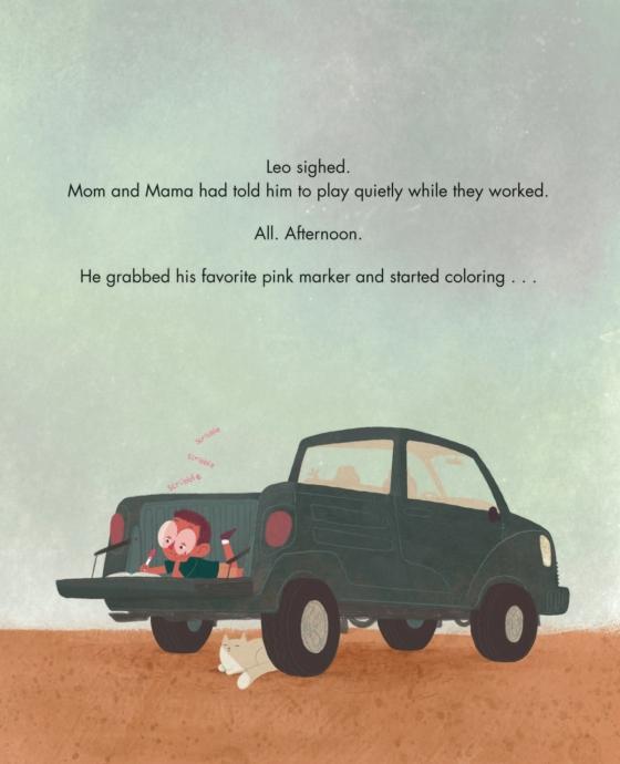 It's fun to color outside the lines in this playful celebration of family, creativity, and the color pink!Leo LOVES doodling away with his pink marker! So when Mom and Mama aren’t looking, he finds an opportunity to liven up the dusty, gray scrapyard. A splash of pink would look great on that crunched-up convertible, and that magnet crane...and the family cat. Uh-oh! Leo got carried away. Will his moms be upset?