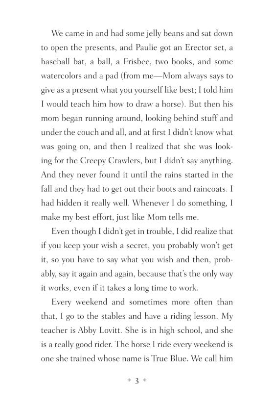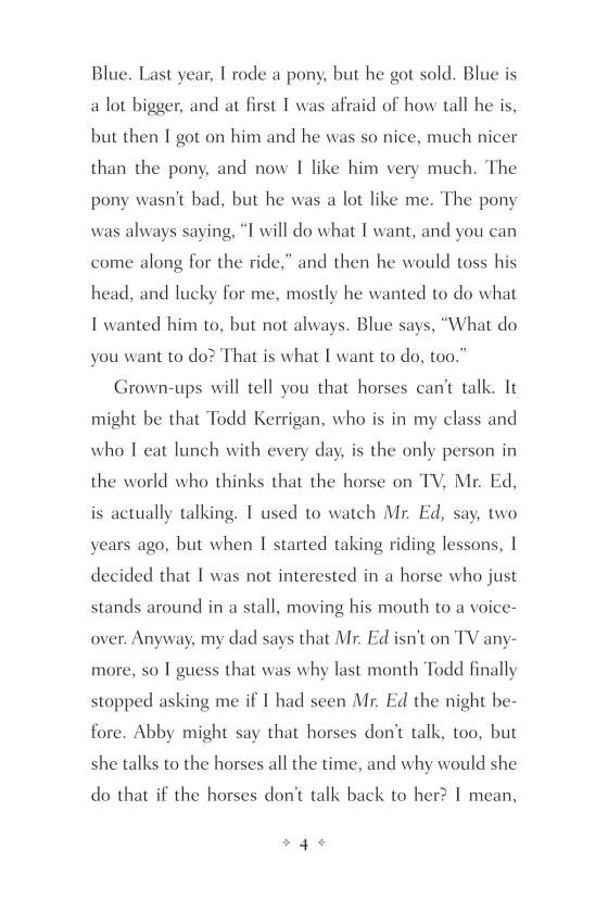 Ned is a colt who used to be a racehorse, until he hurt his leg and moved to Abby’s ranch. Ellen and Ned seem to understand each other, and their companionship is immediate. But Ellen is only allowed to go to riding lessons when she behaves at school. And with all that’s going on, from learning that she’s adopted to finding out her parents are adopting a new baby, it’s harder than ever for Ellen to pay attention and behave in class and at home.