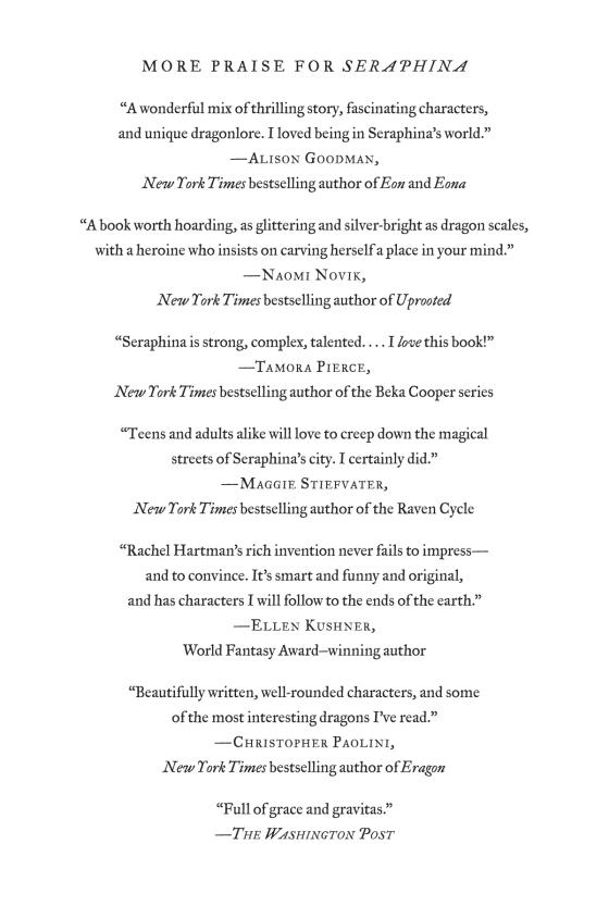 "Rachel Hartman's rich invention never fails to impress--and to convince. It's smart and funny and original, and has characters I will follow to the ends of the earth."—Ellen Kushner, World Fantasy Award-winning author