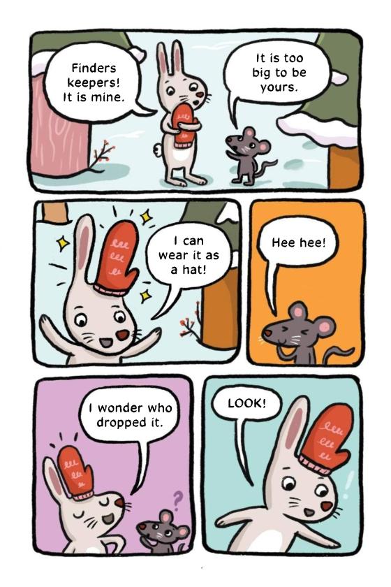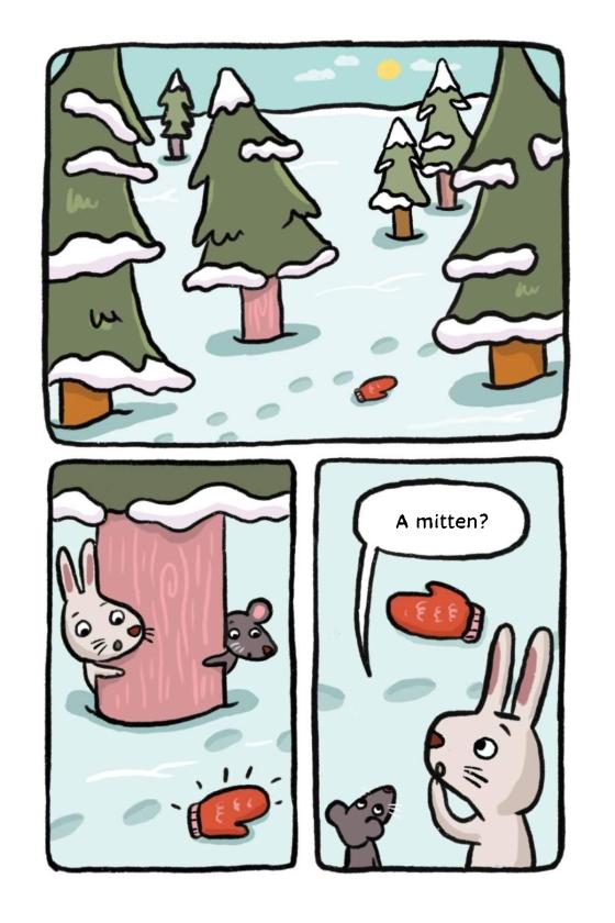 Rabbit and Mouse find a mitten! But who could it belong to? Join the two friends as they journey through the forest in this graphic novel for emerging readers.Oh no! A lost red mitten. Rabbit and Mouse want to return the mitten, but first they’ll have to figure out who it belongs to. Squirrel? No. Badger? Nope. As they continue through the forest and meet new creatures, Rabbit and Mouse are excited to find the real owner. They’re doing a good deed!