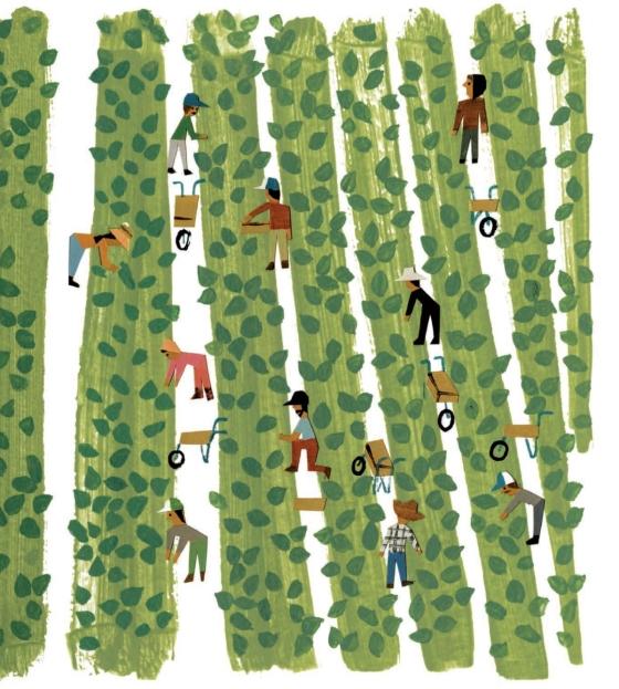 a vibrant place of possibility, and Robinson’s acrylic-and-cutout spreads introduce readers to street vendors, workers in the fields, and sweeping views of the sea. Sensitively conceived and