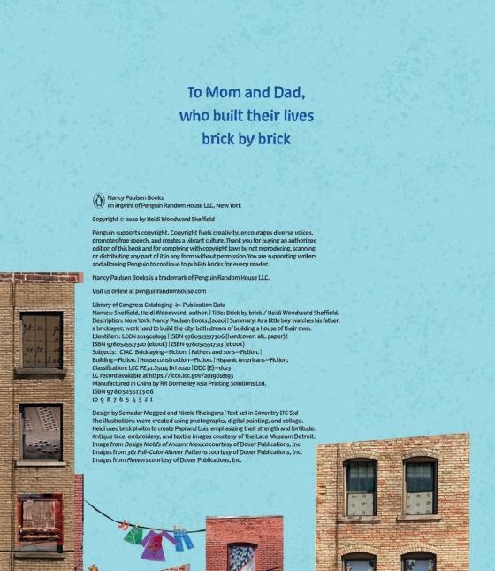 Papi is a bricklayer, and he works hard every day to help build the city, brick by brick. His son, Luis, works hard too--in school, book by book. Papi climbs scaffolds, makes mortar, and shovels sand. Luis climbs on the playground and molds clay into tiny bricks to make buildings, just like Papi. Together, they dream big about their future as they work to make those dreams come true. And then one Saturday, Papi surprises Luis with something special he's built for their family, brick by brick.