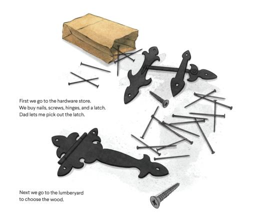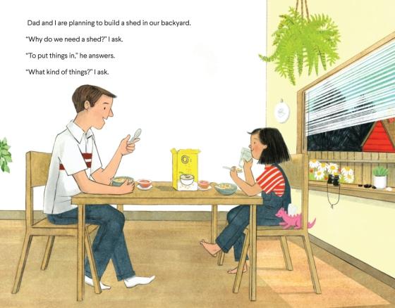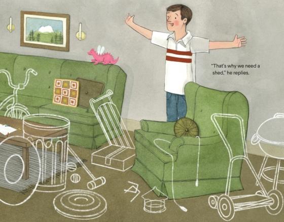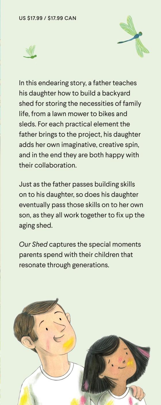 A sweet, nostalgic father-daughter story, Our Shed celebrates DIY families as well as the unique creativity and spontaneity of each individual child.This lovely story is about a father teaching his daughter how to build a backyard shed for storing the necessities of family life--a lawn mower, sprinkler, sleds, kid toys. For each practical element the dad brings to the project, his daughter adds her own imaginative creative spin. In the end, they are both happy with their collaboration.