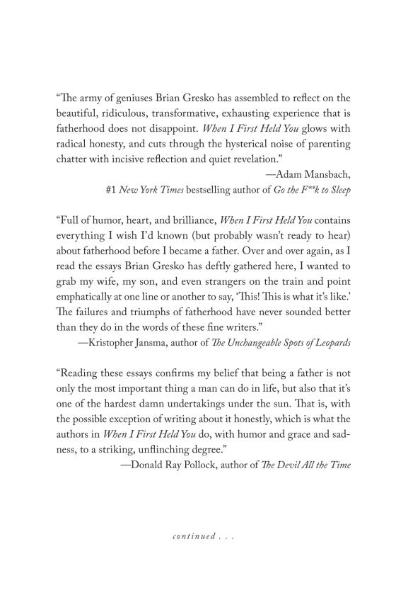 "A collection of luminous essays by men on parenthood that are easily read and terrifically illuminating...Full of remembrances and half-remembrances of parenting in all its glory: failure, triumph, joy, tribulation, humorous bits and tragedies big and small...Readers will laugh, or perhaps wipe a tear; parents will nod knowingly."—Shelf Awareness