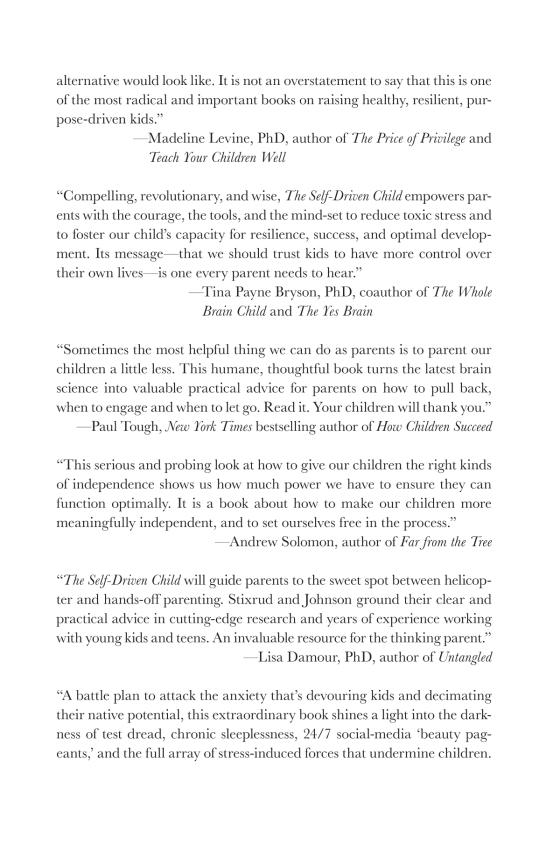 The Self-Driven Child will guide parents to the sweet spot between helicopter and hands-off parenting. Stixrud and Johnson ground their clear and practical advice in cutting-edge research and years of experience working with young kids and teens. An invaluable resource for the thinking parent." —