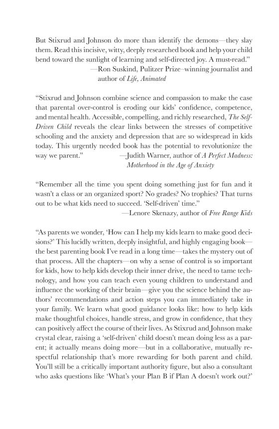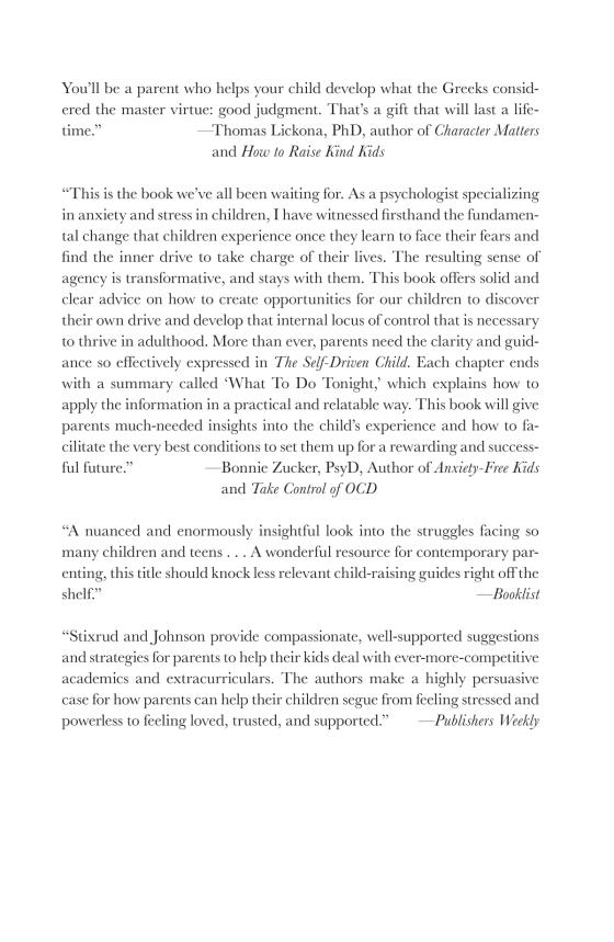 – Lenore Skenazy, author of Free Range Kids“As parents we wonder, 'How can I help my kids learn to make good decisions?' This lucidly written, deeply insightful, and highly engaging book—the best parenting book I’ve read in a long time—takes the mystery out of that process. All the chapters—on why a sense of control is so important for kids, how to help kids develop their inner drive, the need to tame technology, and how you can teach even young children to understand and influence the working of their brain—give you the science behind the authors’ recommendations and action steps you can immediately take in your family. We learn what good guidance looks like: how to help kids make thoughtful choices, handle stress, and grow in confidence that they can positively affect the course of their lives. As Stixrud and Johnson make crystal clear, raising a 'self-driven' child doesn’t mean doing less as a parent; it actually means doing more—but in a collaborative, mutually respectful relationship that’s more rewarding for both parent and child. You’ll still be a critically important authority figure, but also a consultant who asks questions like 'What’s your Plan B if Plan A doesn’t work out?' You’ll be a parent who helps your child develop what the Greeks considered the master virtue: good judgment. That’s a gift that will last a lifetime. “ —