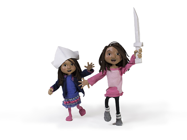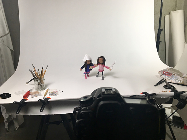 I created these characters out of wire, foam, polymer clay, pinheads, and suede. I have two young daughters and so I made the girls’ clothes from old clothes that each of my small ladies used to wear and love.