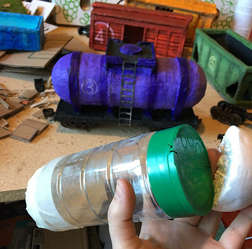 I used a LOT of unusual objects but most bizarre was an empty parmesan cheese container combined with a sliced foam ball. It was the perfect diameter and material to be the base of the tanker car!